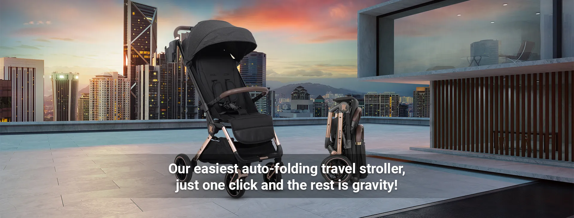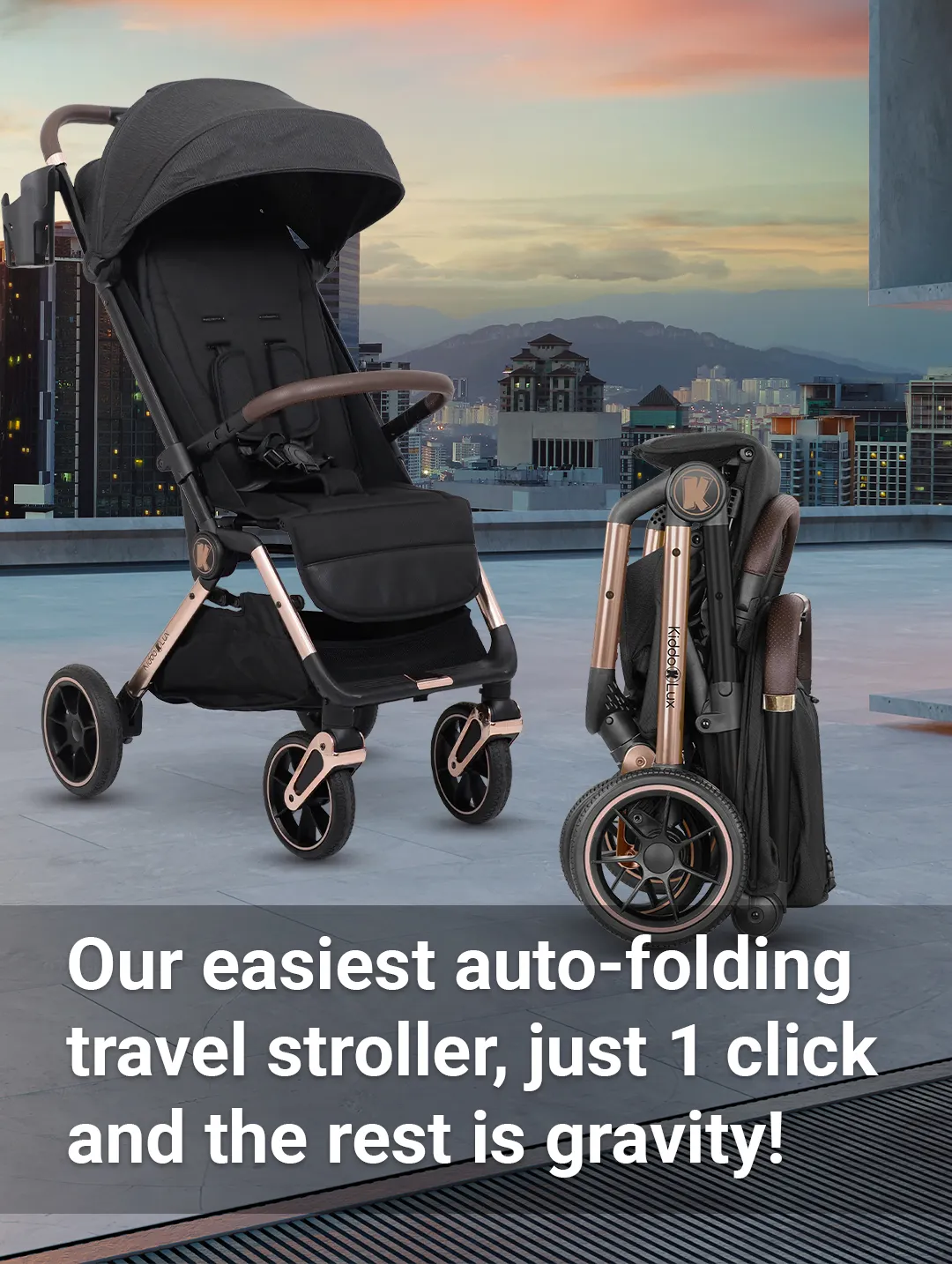 A travel stroller suitable for children from birth up to 22 kg and with an easy one-hand auto-folding mechanism