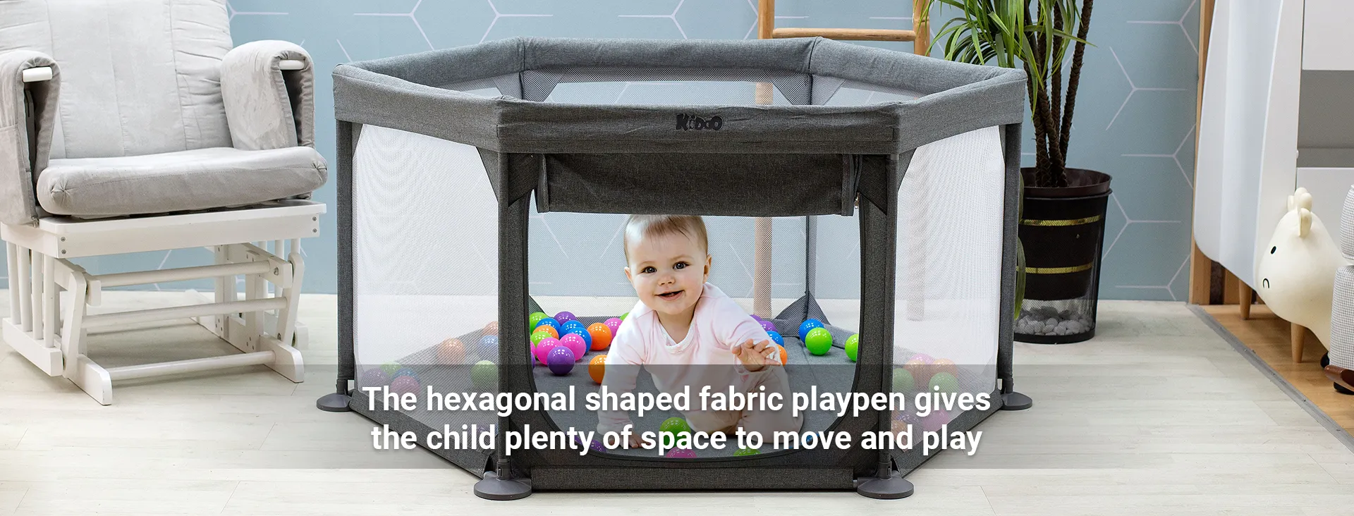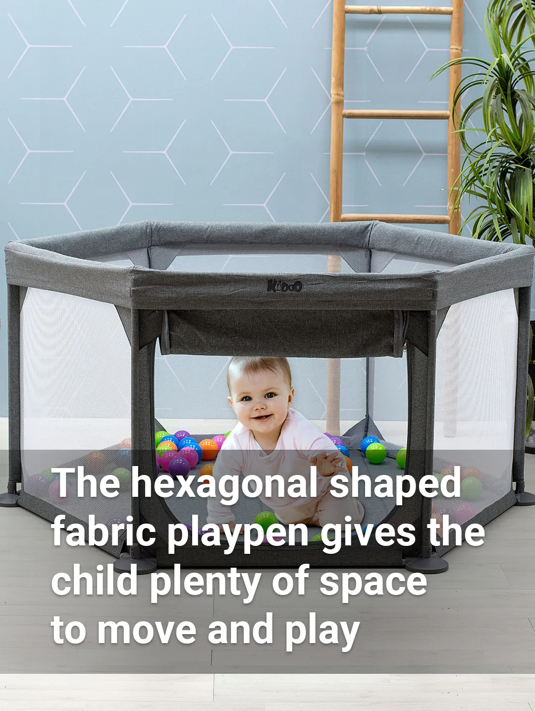• The hexagonal shaped fabric playpen gives the child plenty of space to move and play
