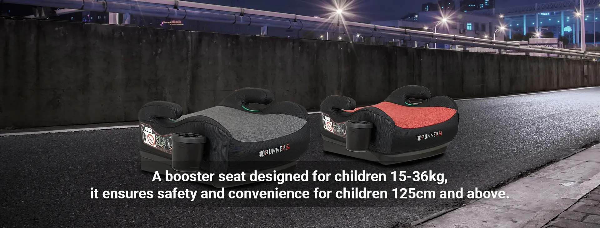 A booster seat designed for children 125cm and above (15-36kg) features a wide seatbelt guide, ergonomic design, and armrests for enhanced comfort.